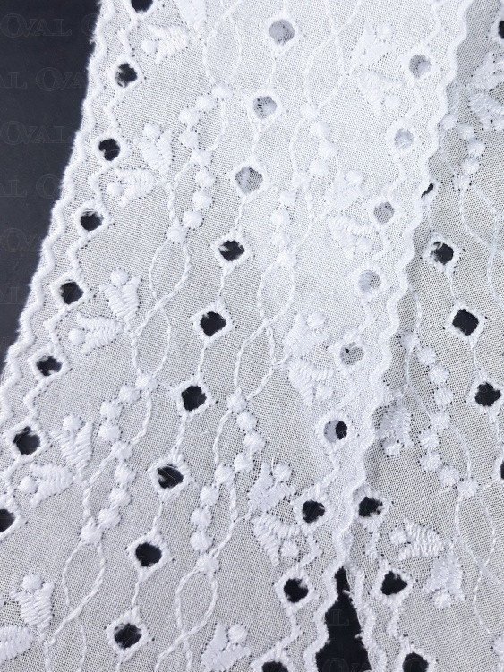 Sklep krawiecki Oval oferuje haft angielski w kolorze białym, wykonany na białej, naturalnej, oddychającej tkaninie. Wykonany został maszynowo. Sprzedajemy koronkę na metry bieżące. Cena podana poniżej, to cena za 1 metr bieżący. Szerokość koronki umożliwia zastosowanie jej na wiele sposobów. W naszym asortymencie znajduje się produkt, o szerokości 27 mm.