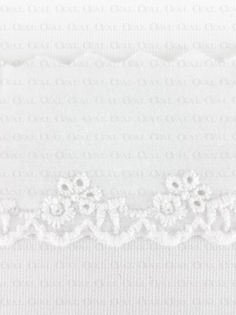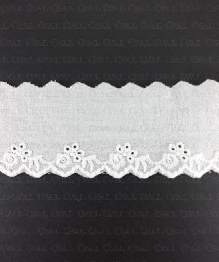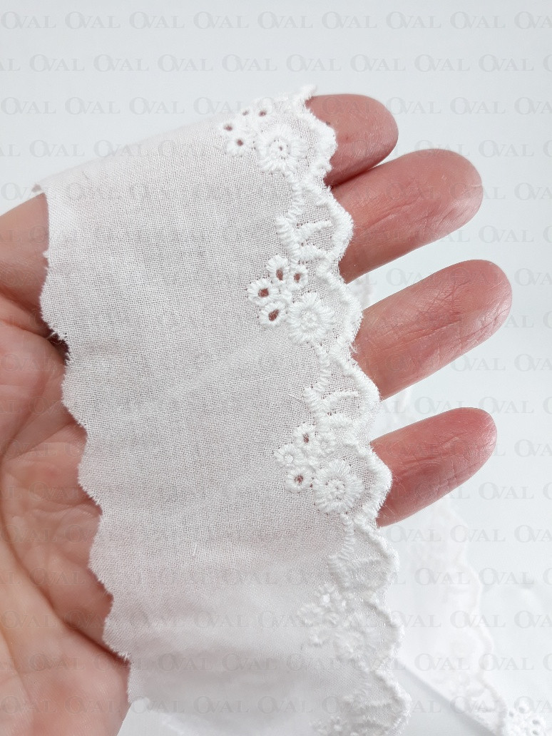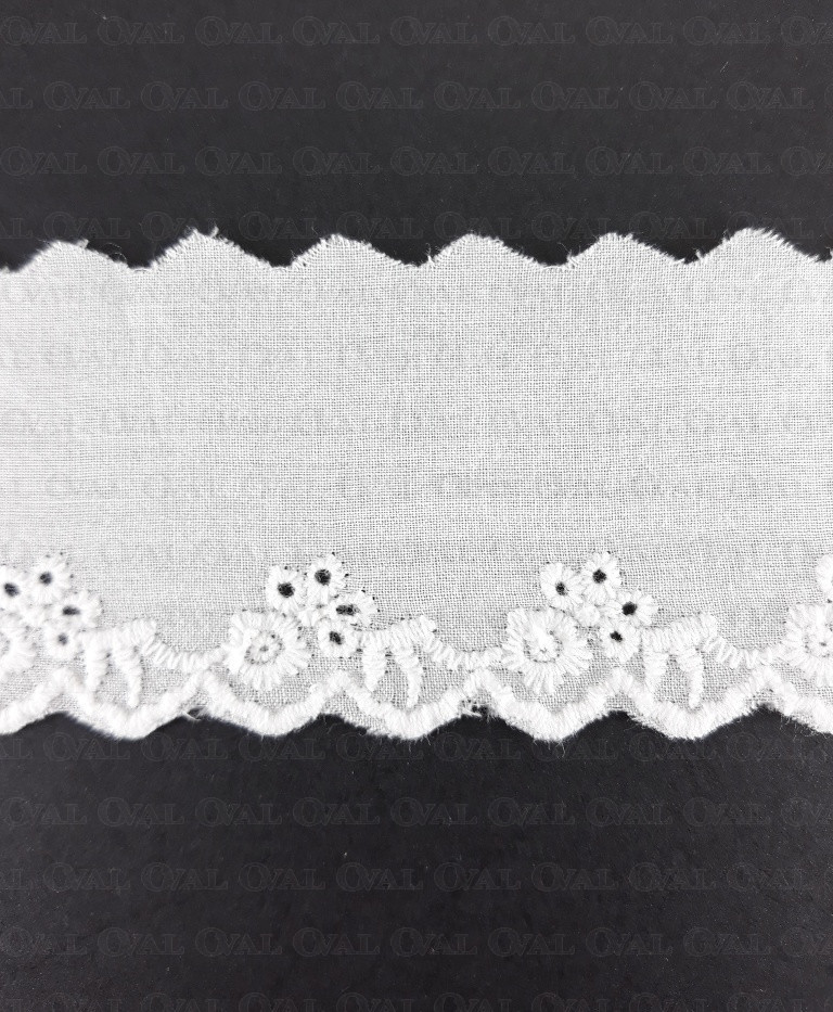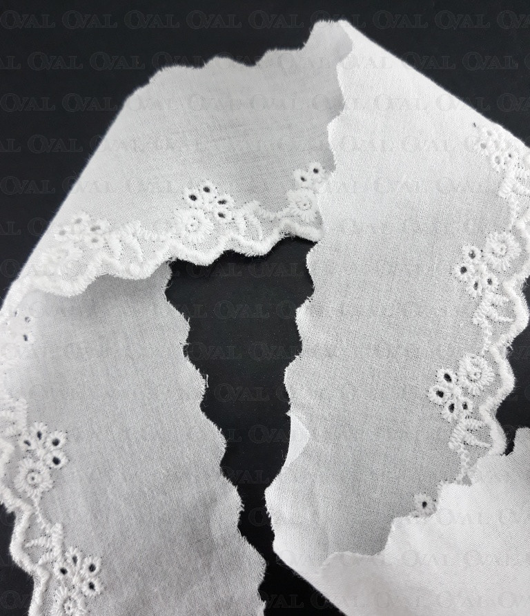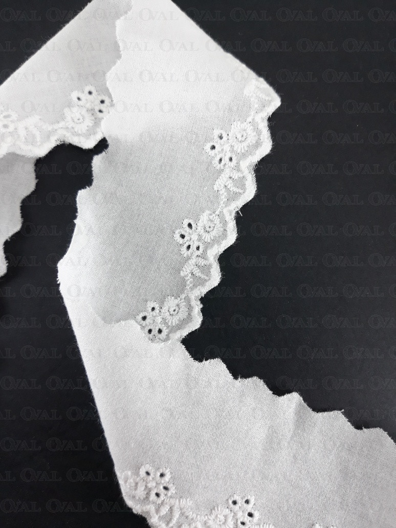 Koronka bardzo dobrej jakości z ażurowym wzorem haftowana na bawełnie.