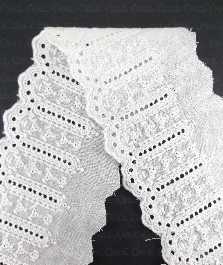 Koronka bardzo dobrej jakości z ażurowym wzorem haftowana na bawełnie.