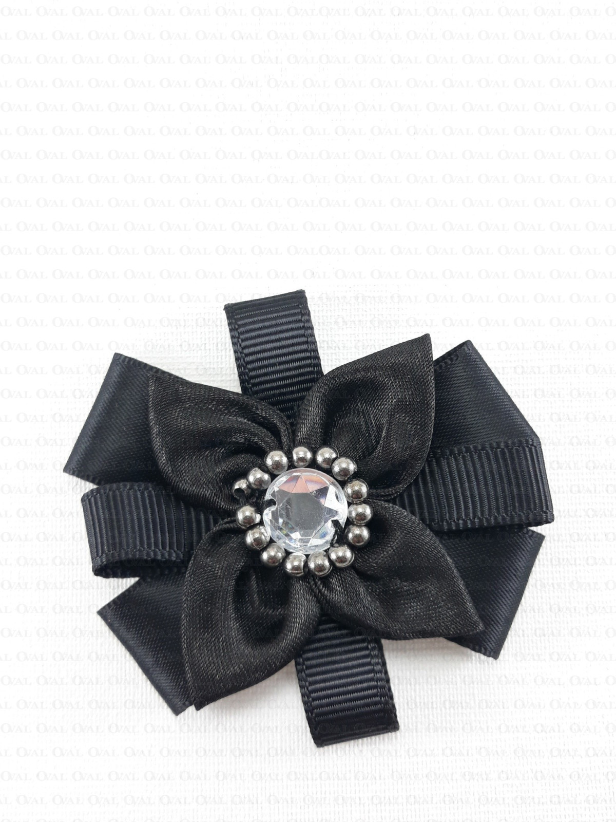 Kokarda z taśmy atłasowej z naszytymi koralikami i kamieniem.