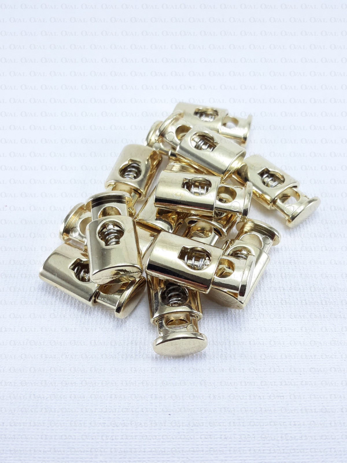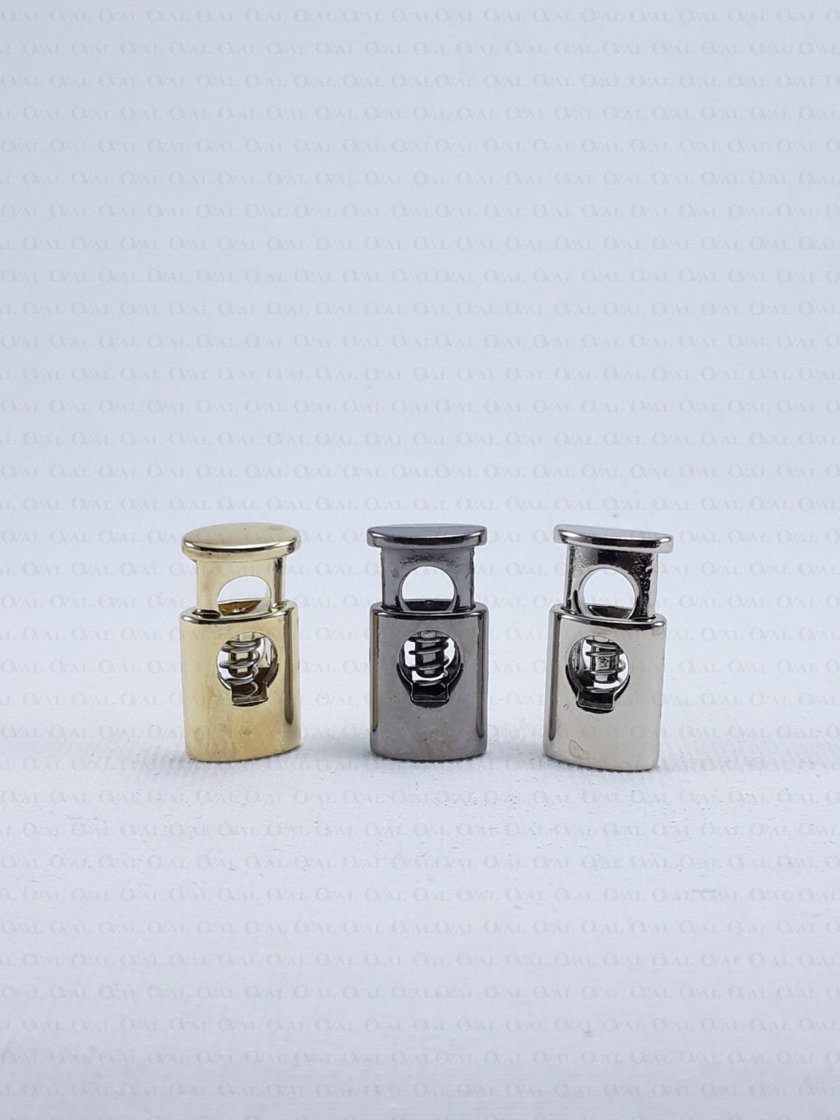 Metalowy, spłaszczony stoper jednodziurkowy.