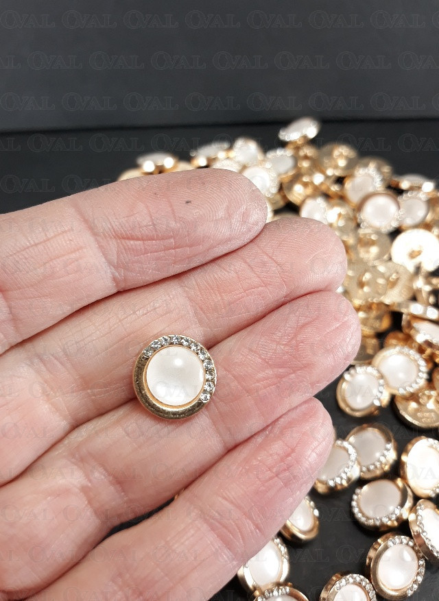 Guzik metalowy z perłowym oczkiem i dżetami.