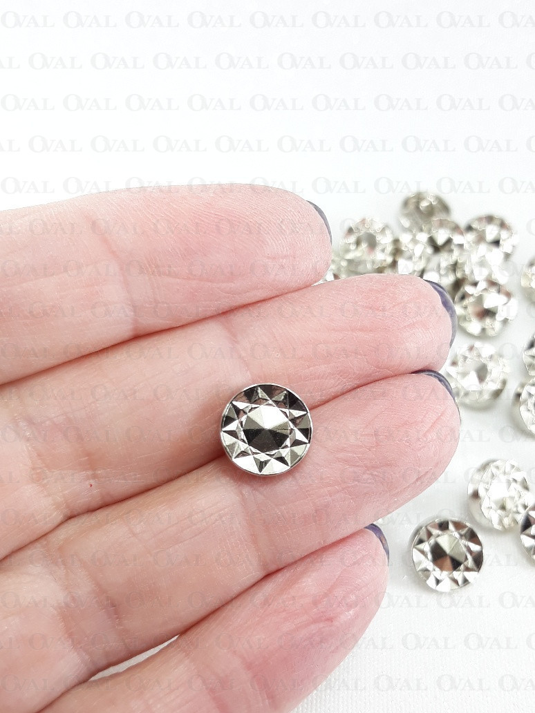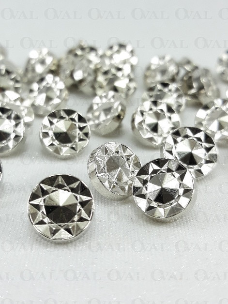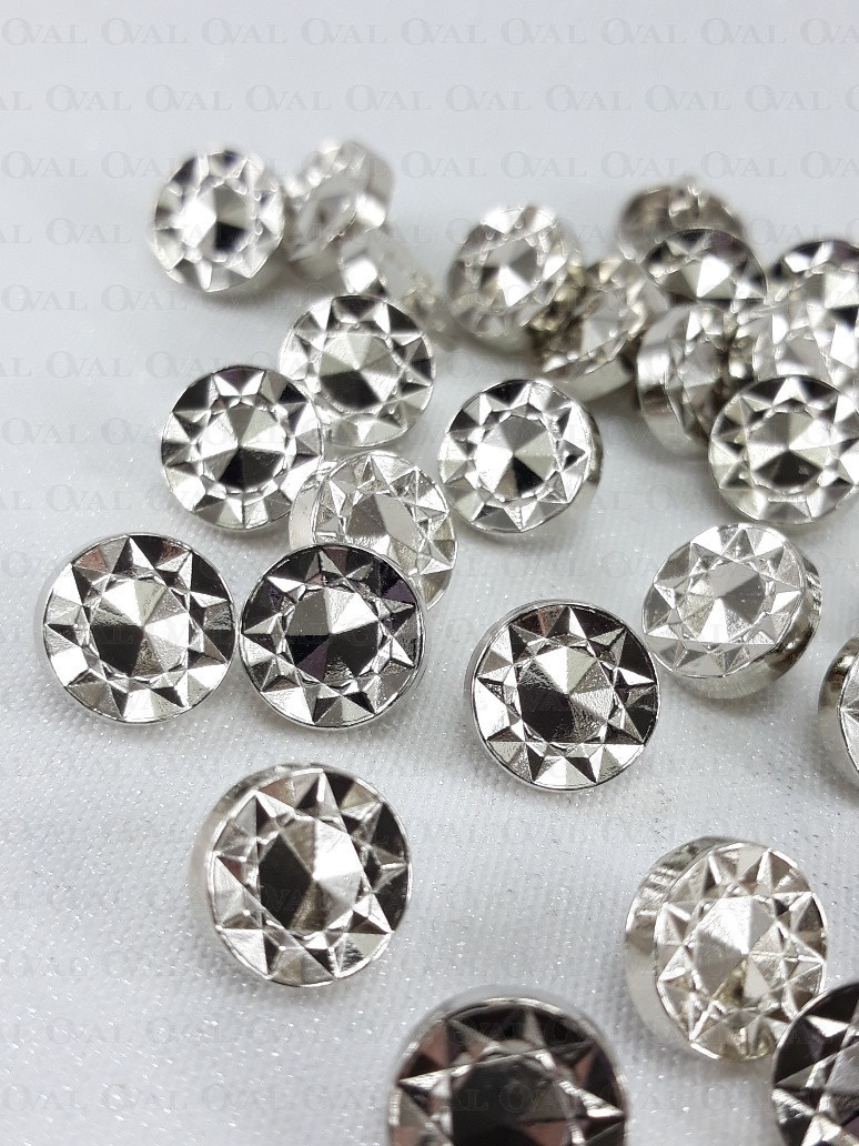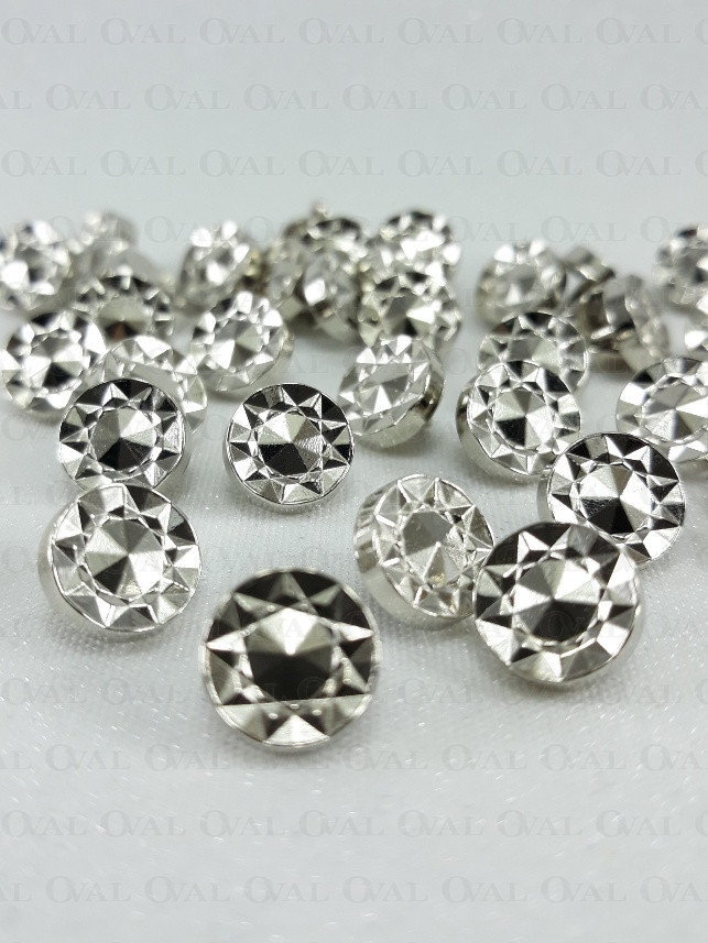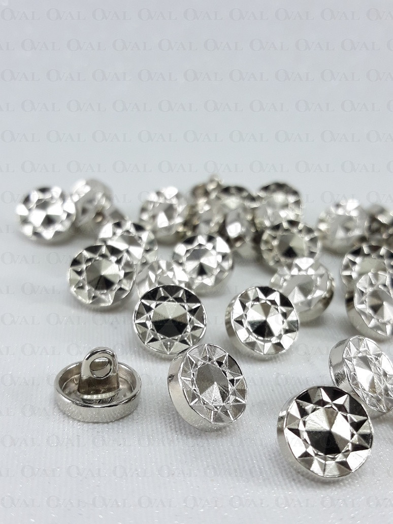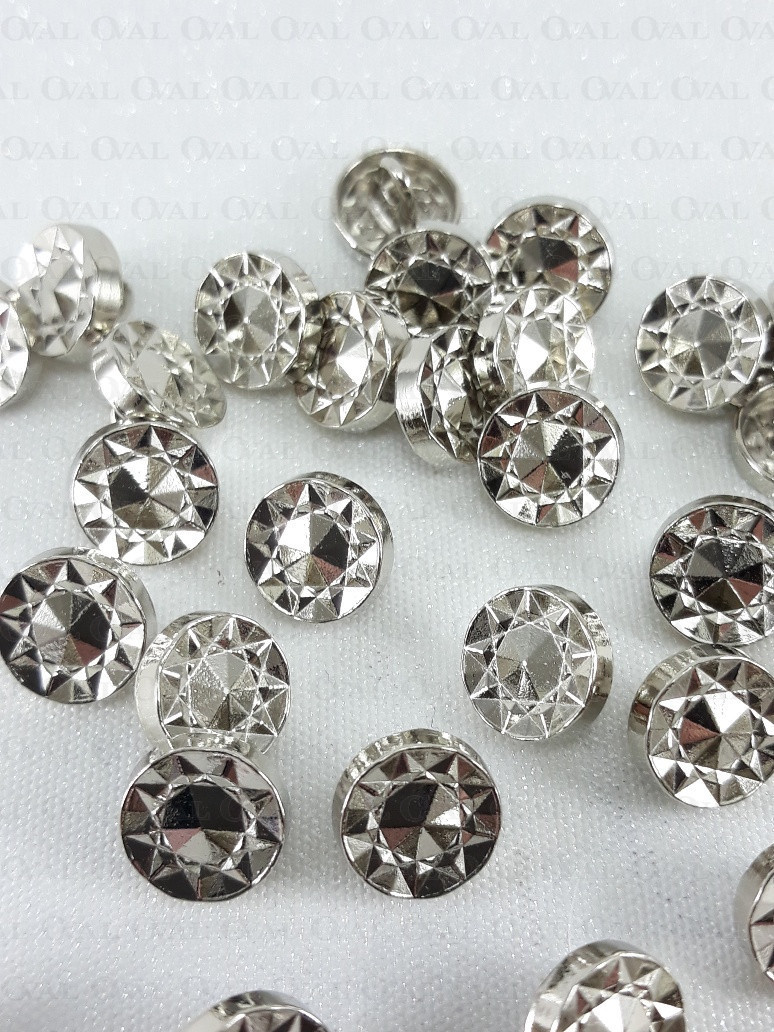 Guzik metalowy z cięciami dzięki czemu pięknie odbija światło.