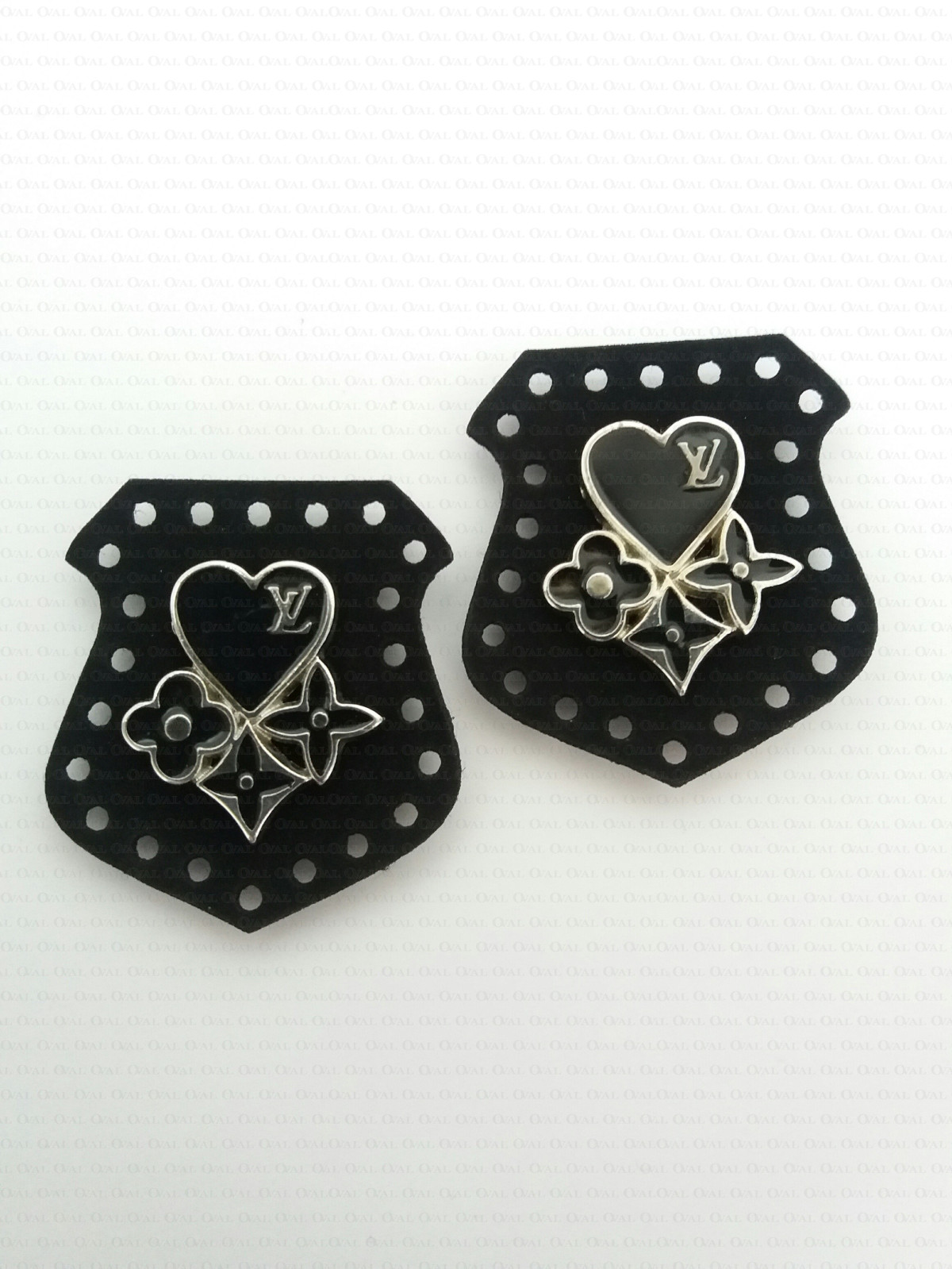 Emblemat ze skóry ekologicznej z metalowym sercem i kwiatkami.