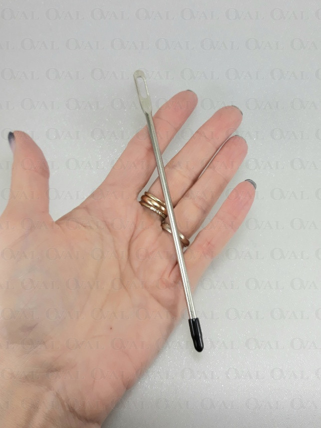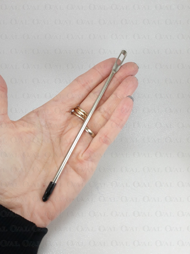 Metalowy przyrząd do przewlekania z ostrą końcówką zabezpieczony sylikonową zatyczką.