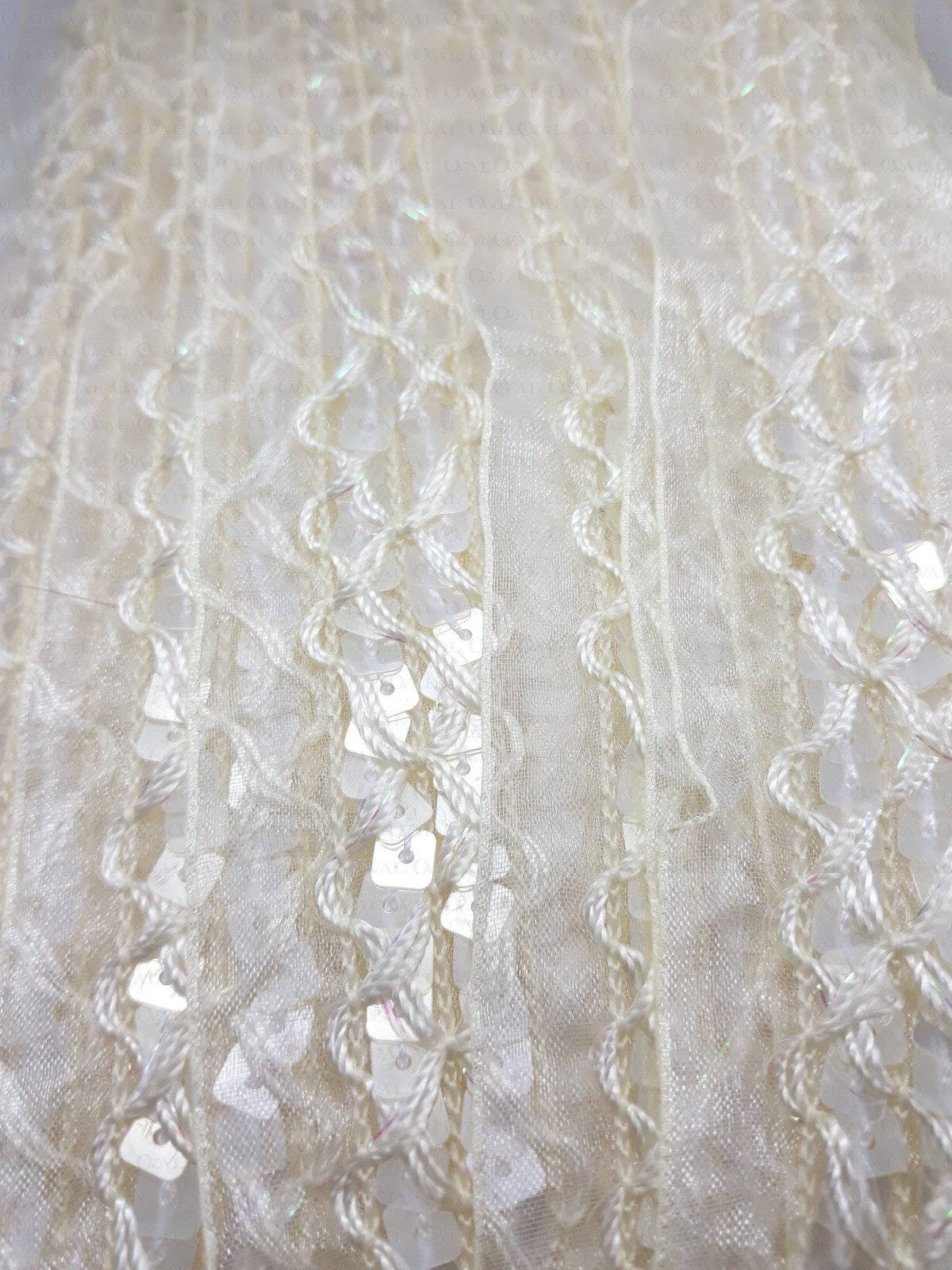 Szyfonowa taśma ozdobna z grubą nitka i kwadratowymi cekinami.