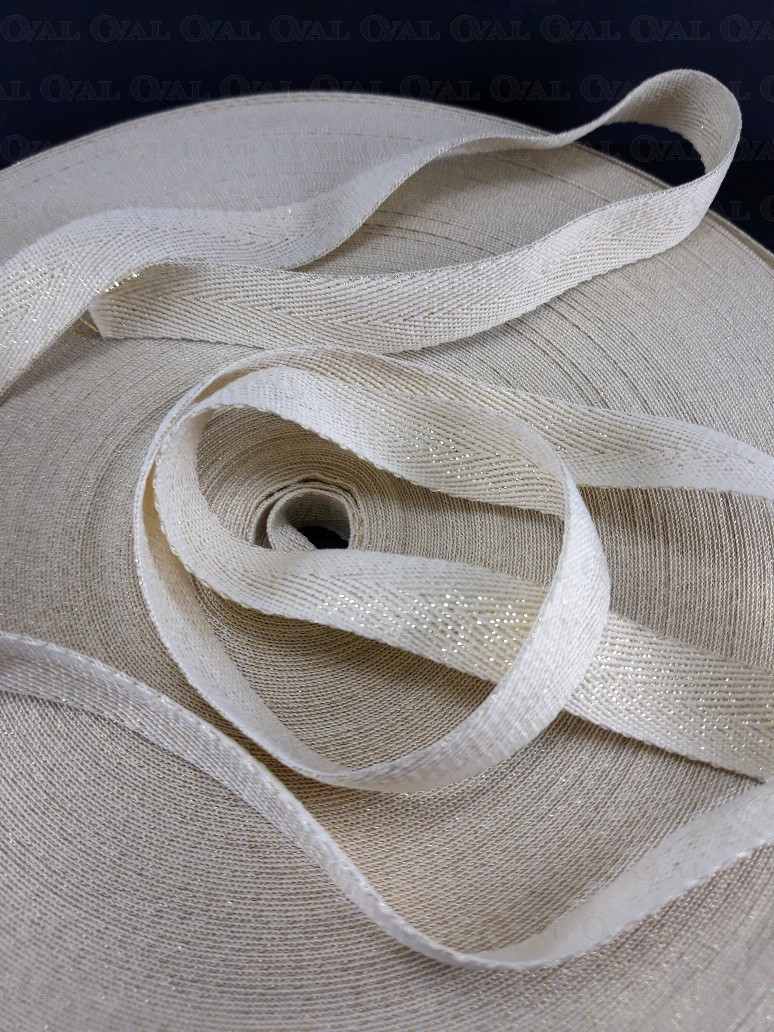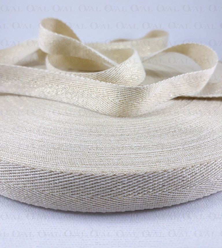 Taśma ozdobna tkana w jodełkę z delikatną złotą nitką.
