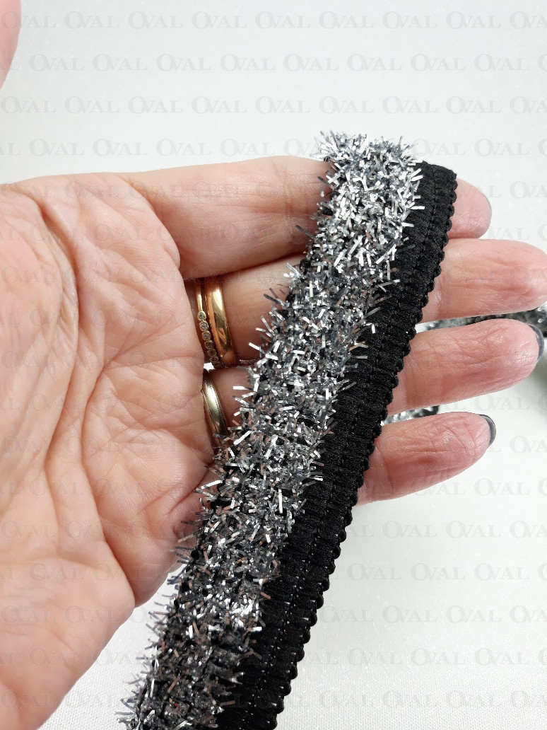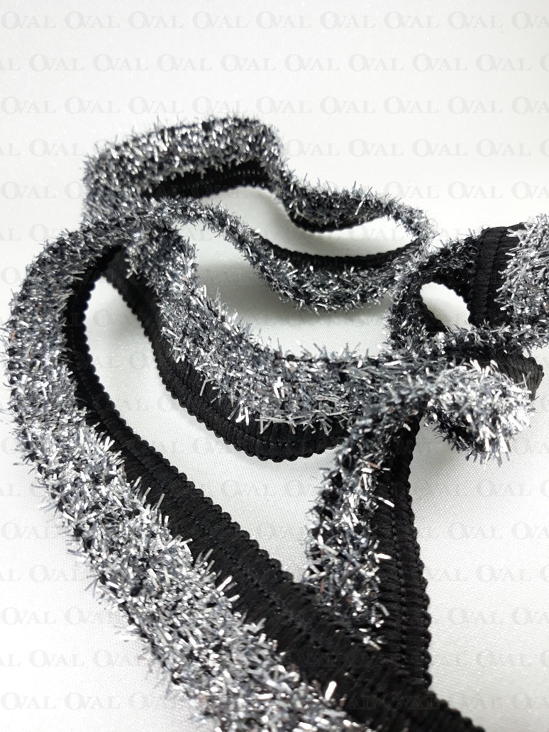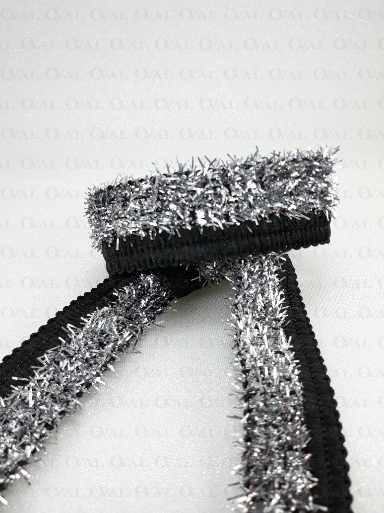 Ozdobna taśma poliestrowa ze srebrnym wykończeniem.