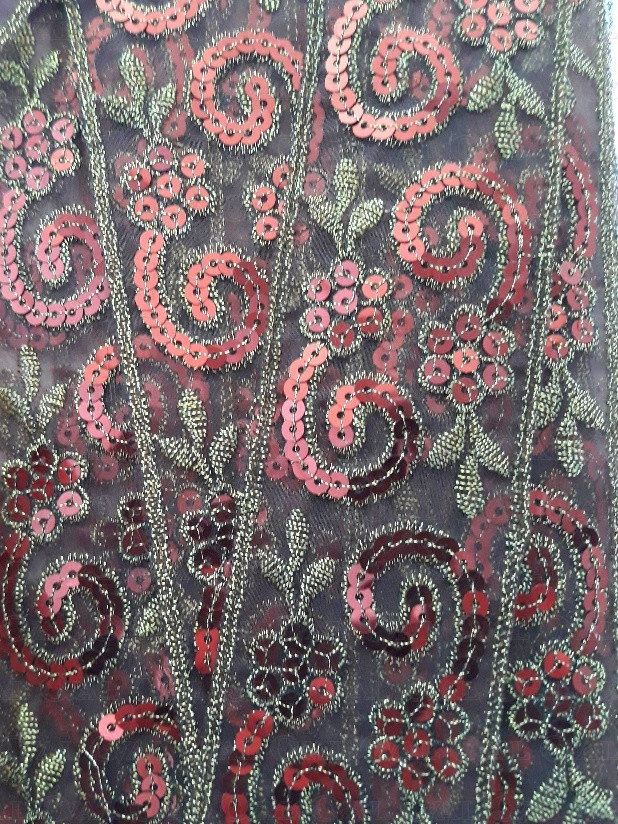 Kolor: brązowy tiul, brązowo bordowe cekiny i złoto zielony haft