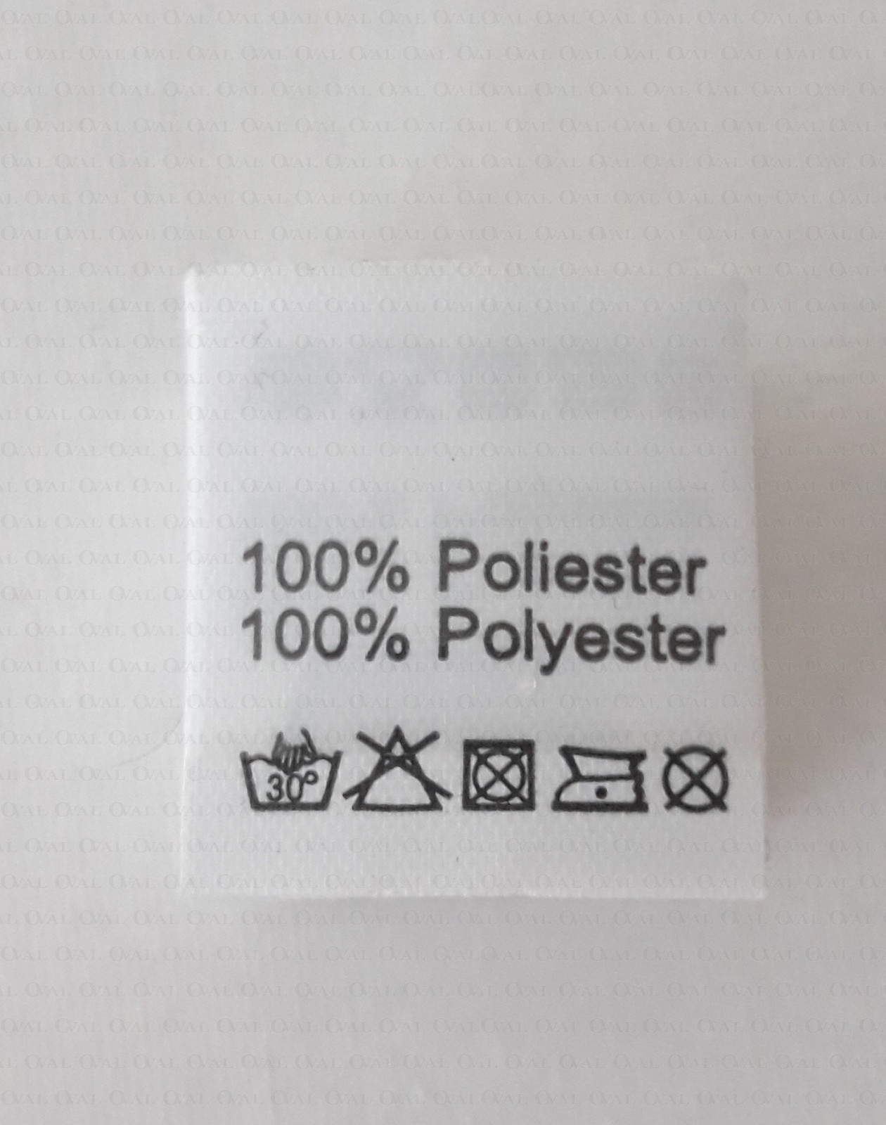 Wszywka odzieżowa zawierająca skład surowcowy oraz przepis prania uszytego produktu.
