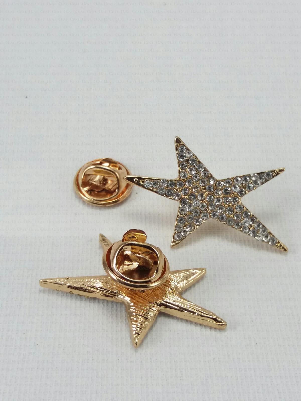 Metalowy pin w kształcie gwiazdy z dżetami.