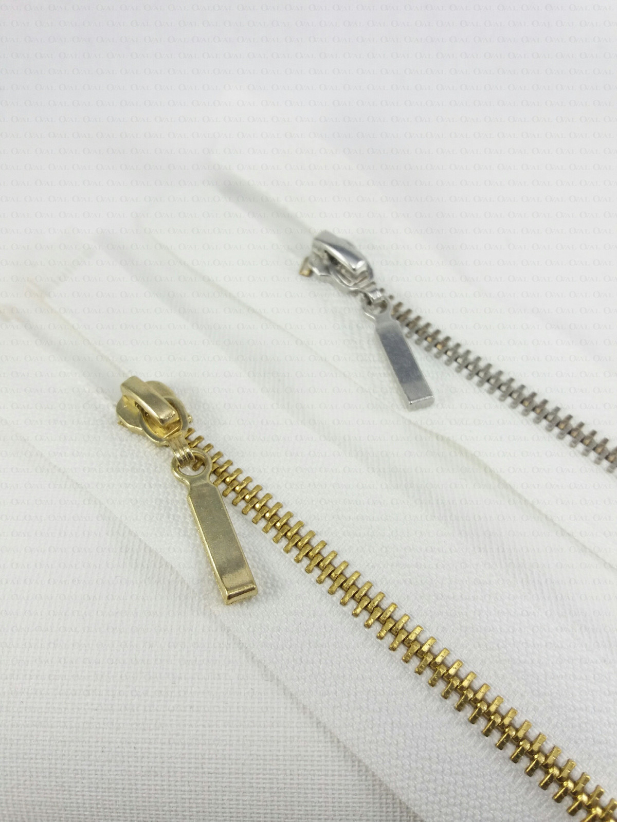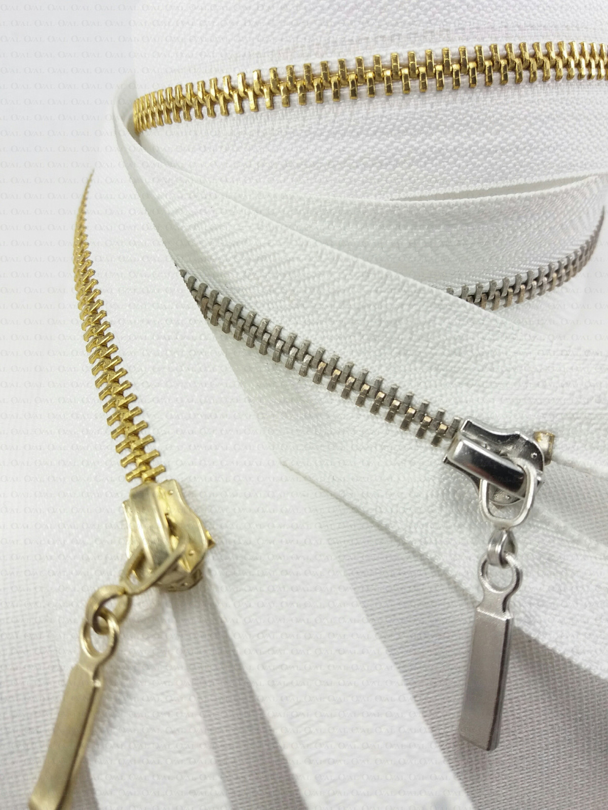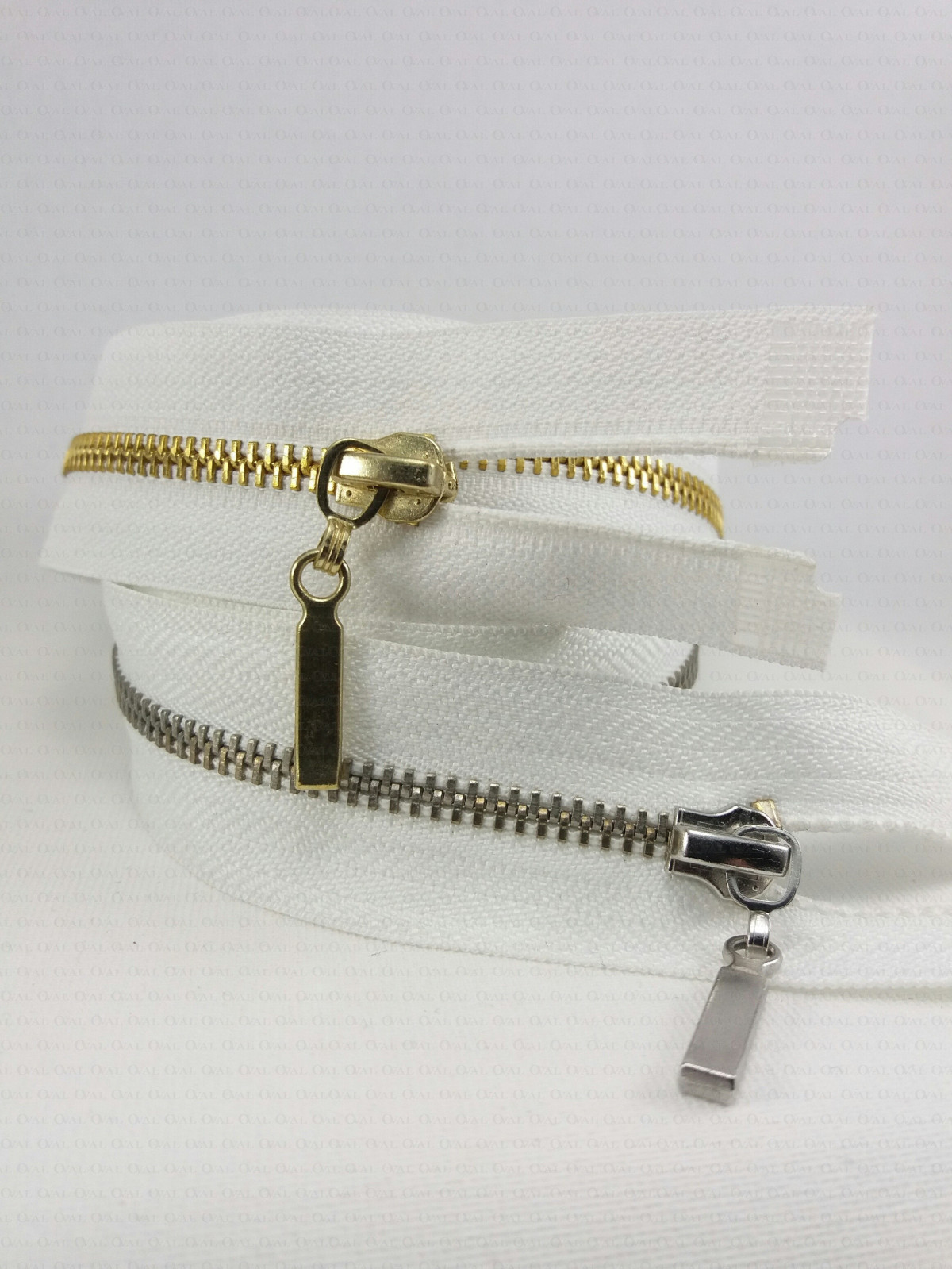 W długości 50cm zamki posiadają dwa wykończeni kolorystyczne :biała taśma srebrne ząbki oraz biała taśma złote ząbki.