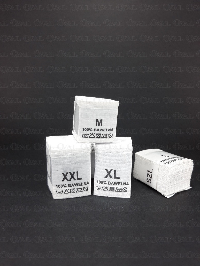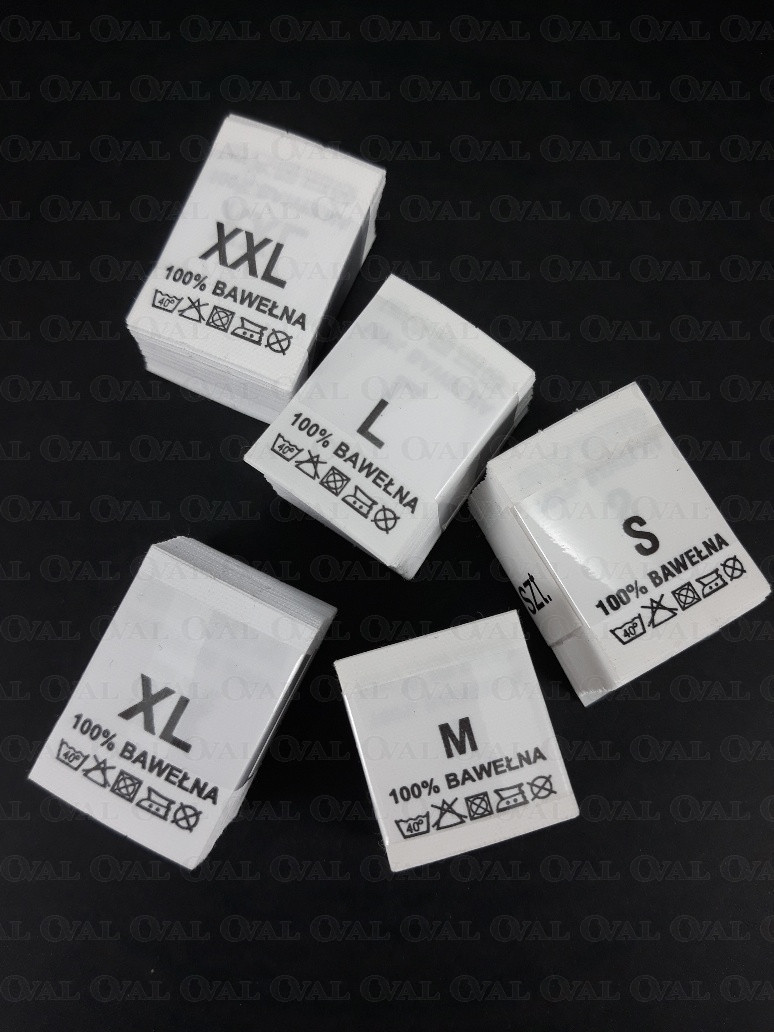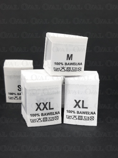 Wszywki rozmiarowe z przepisem prania składem surowcowym do odzieży damskiej i męskiej
