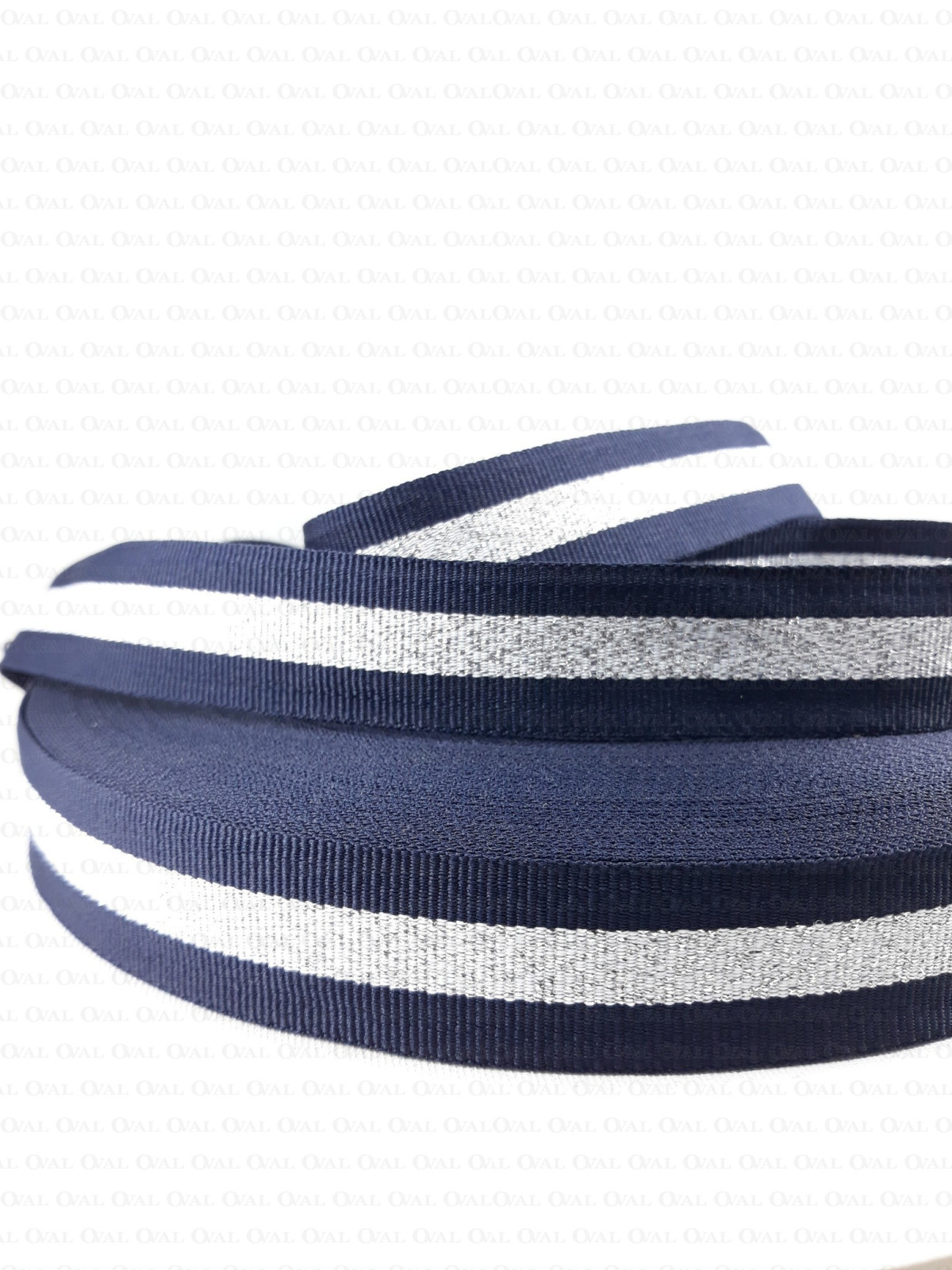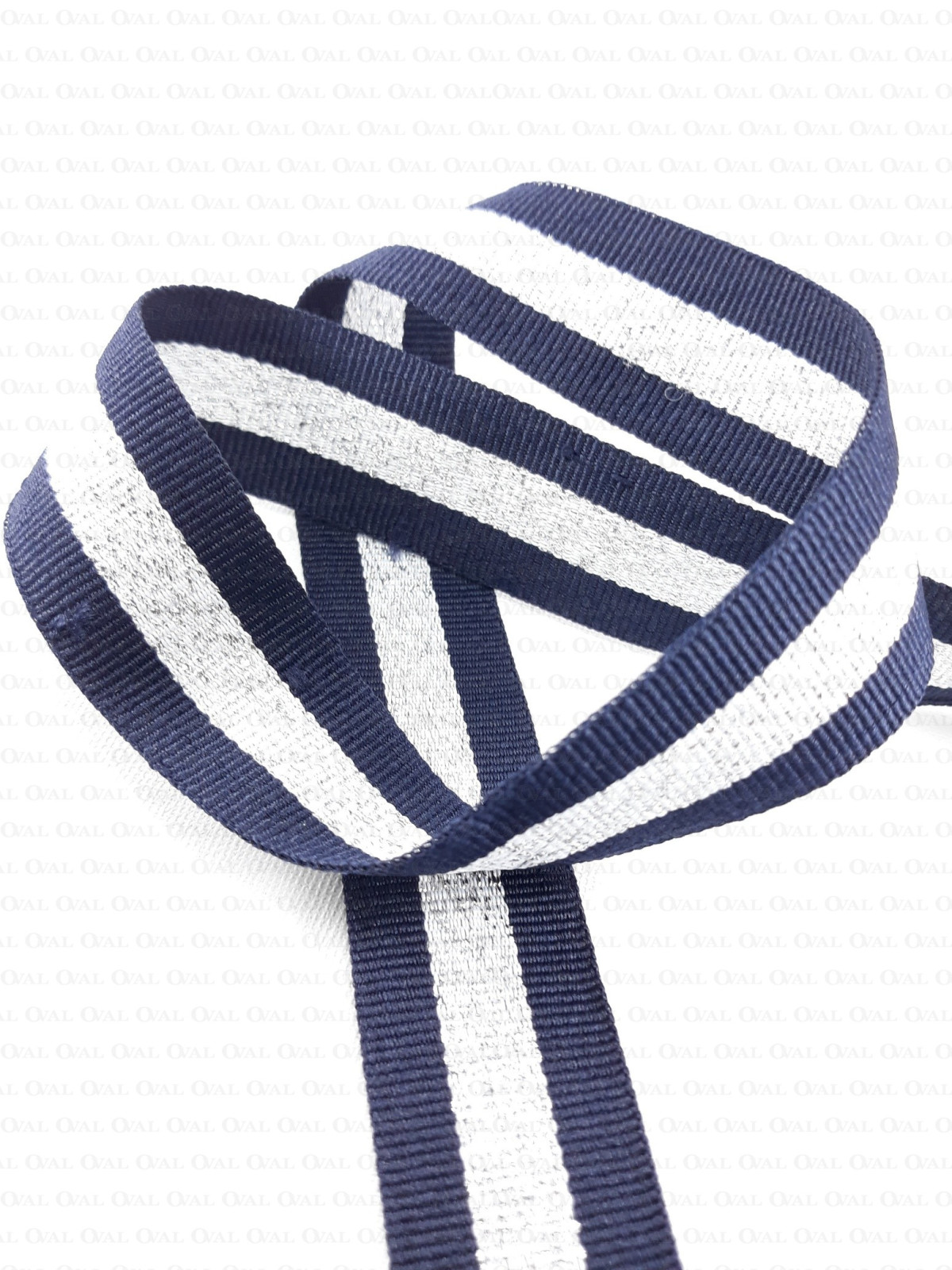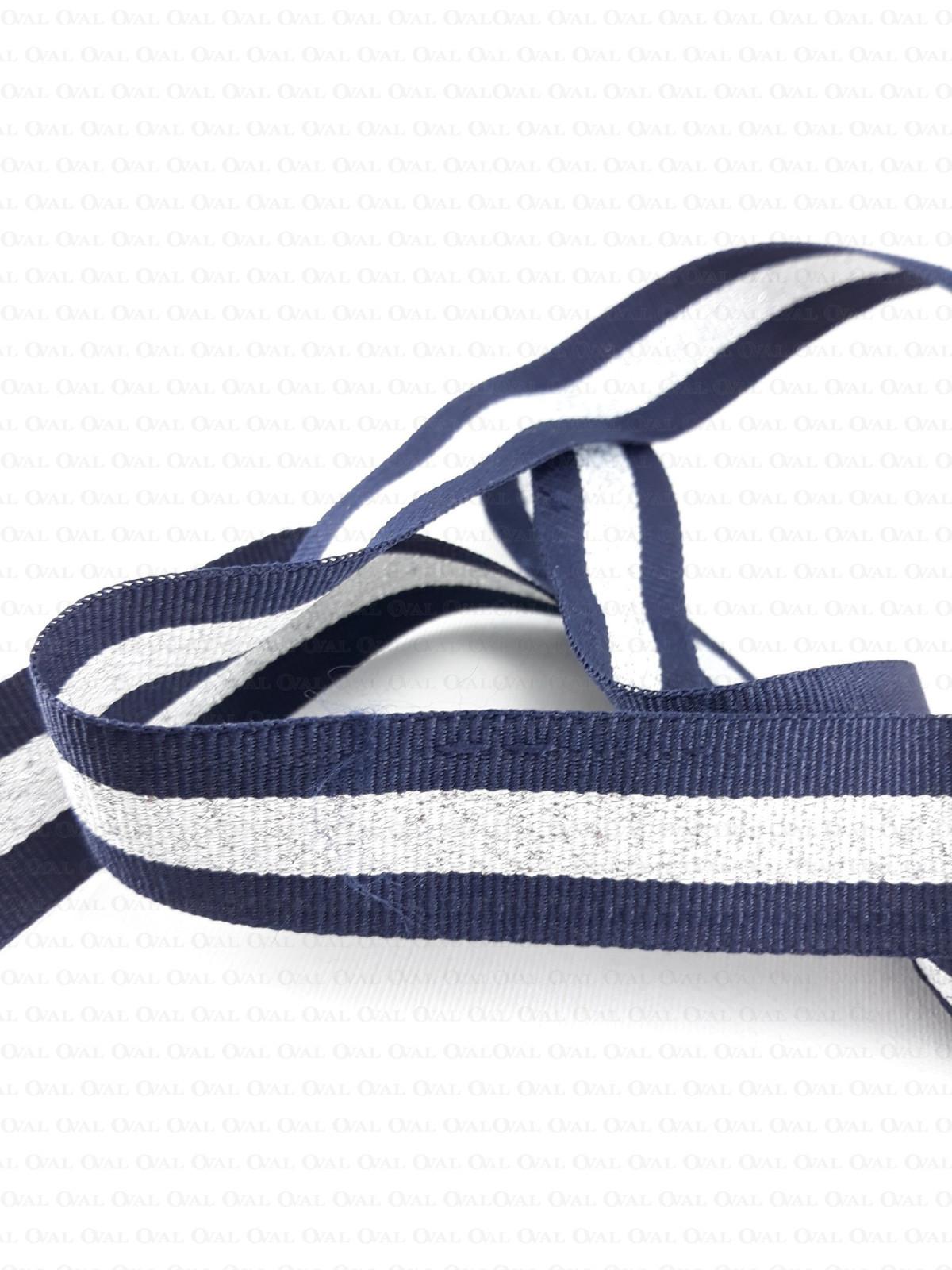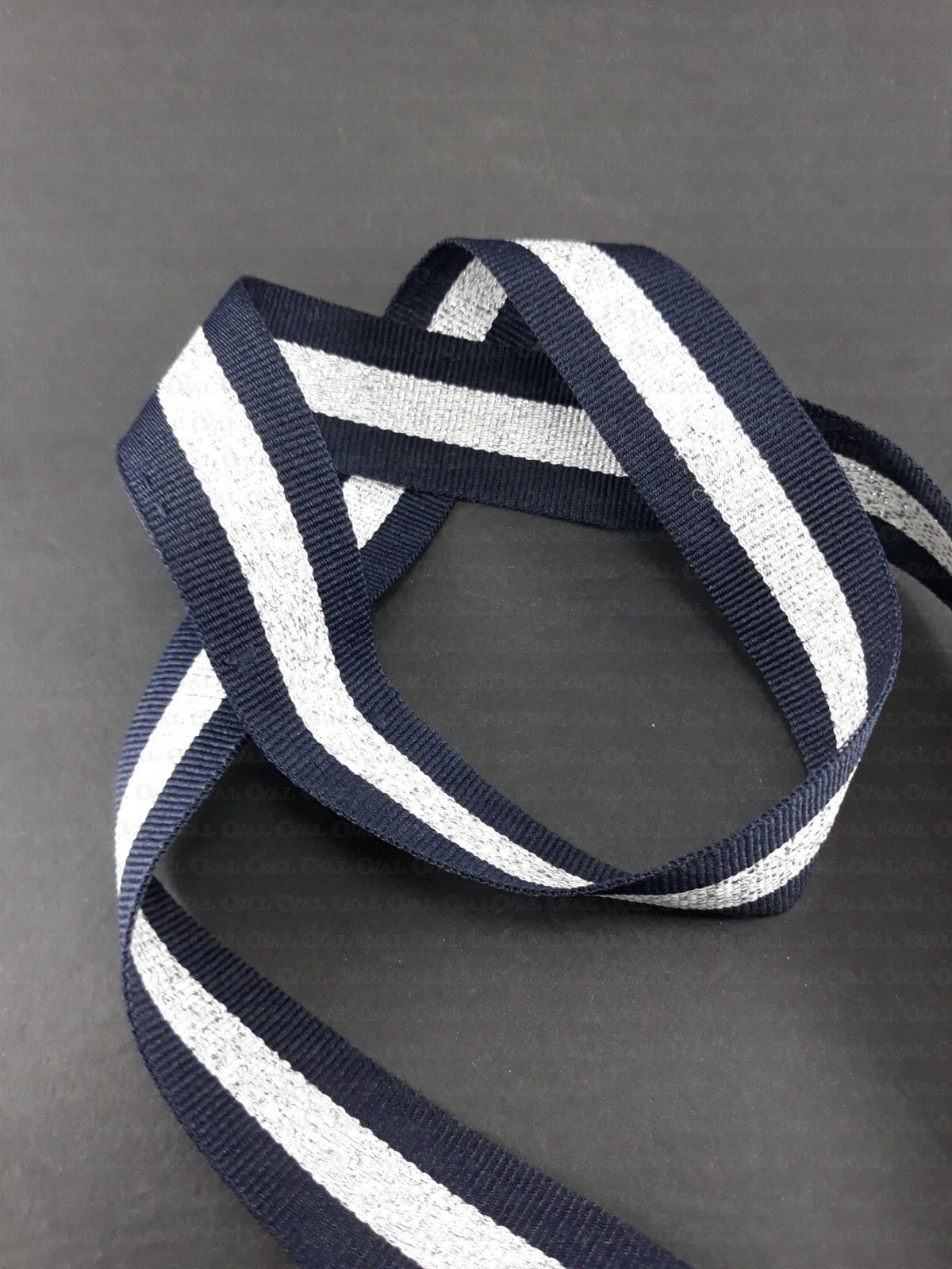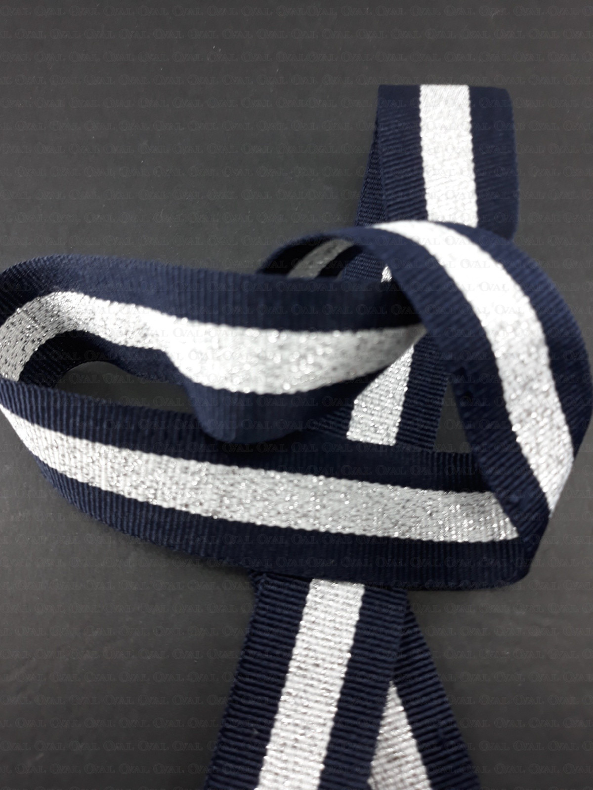 Ozdobna taśma rypsowa, granatowa ze srebrnym paskiem.