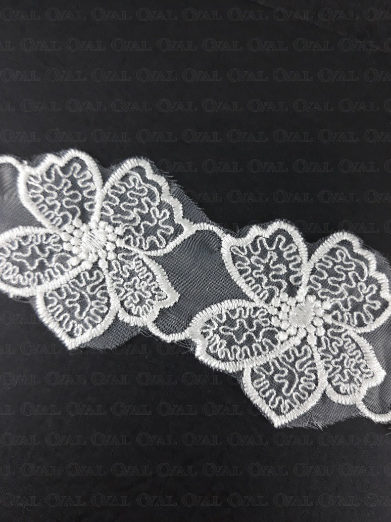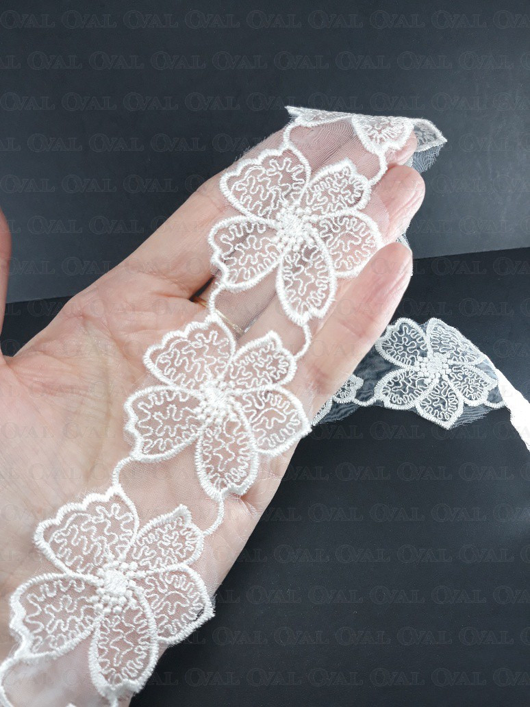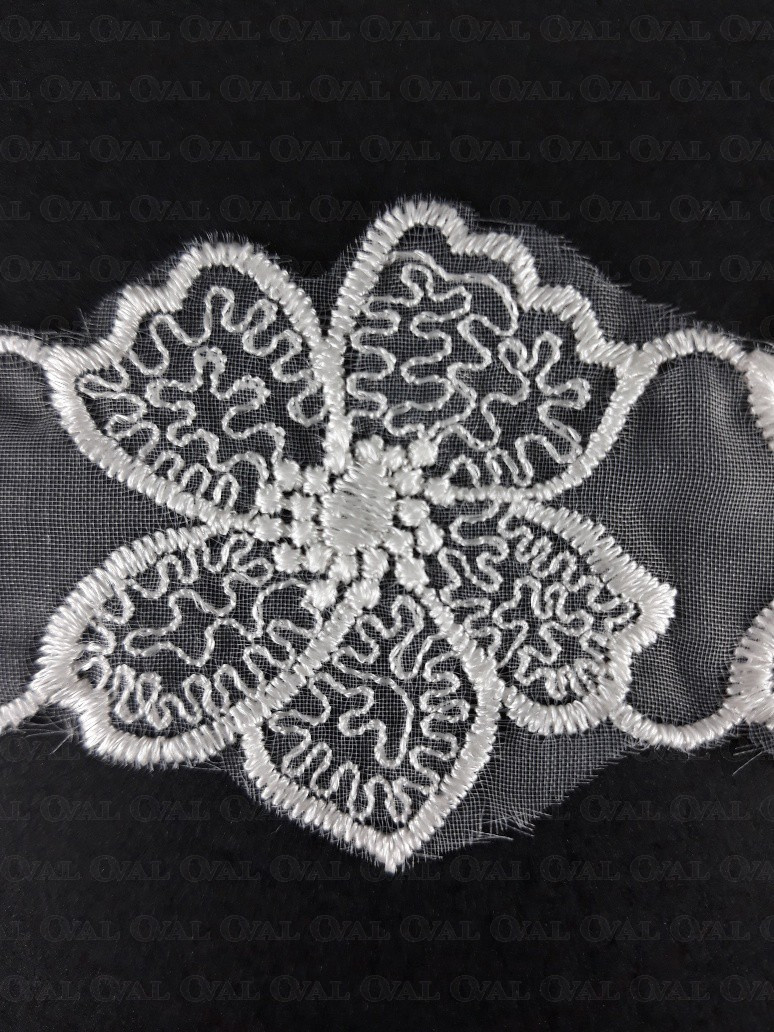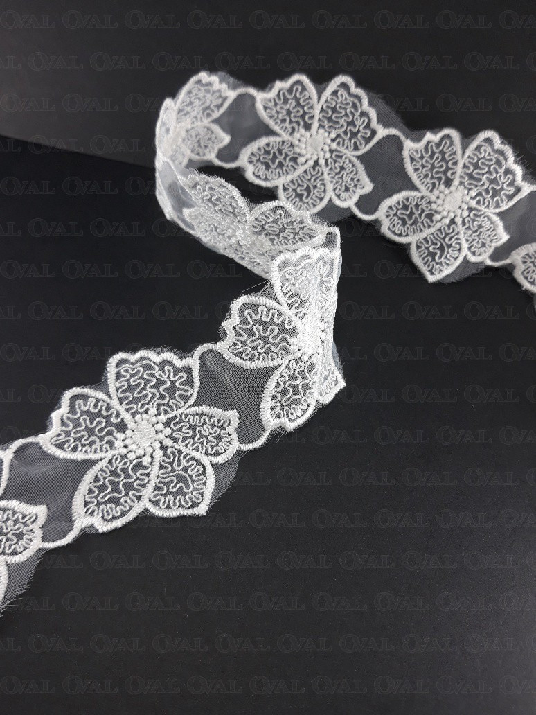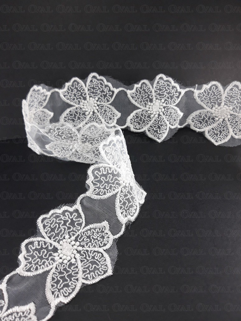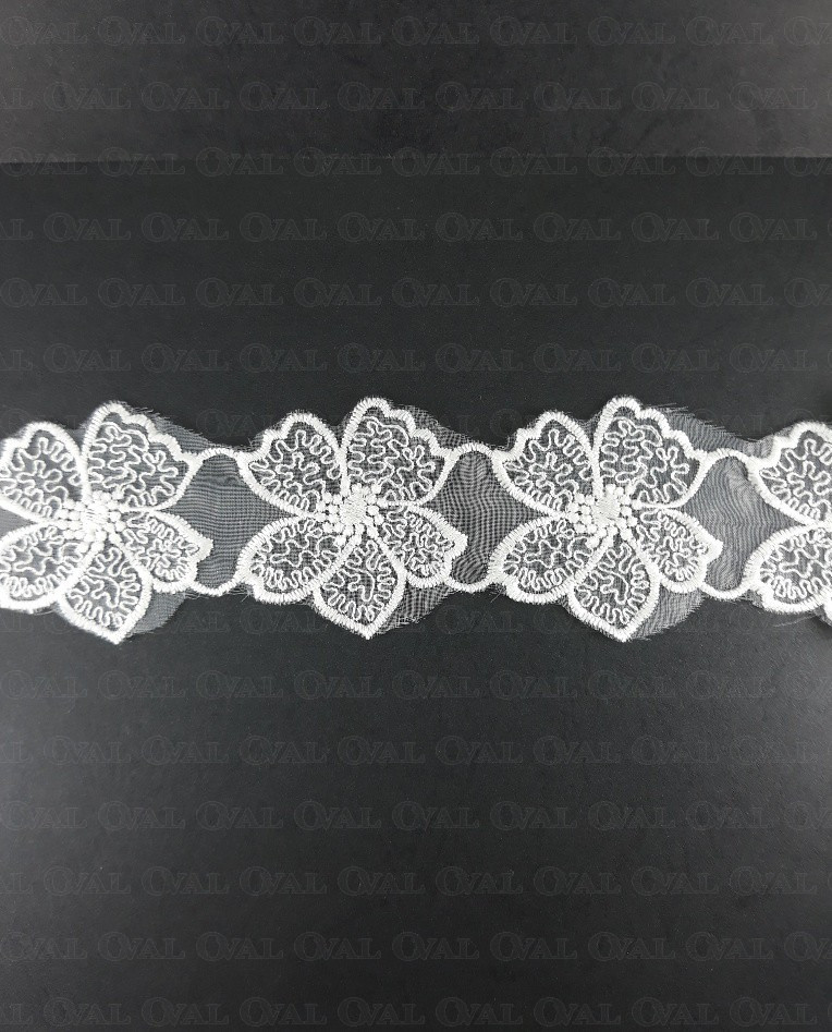 Delikatna koronka na szyfonie z delikatnym połyskiem.