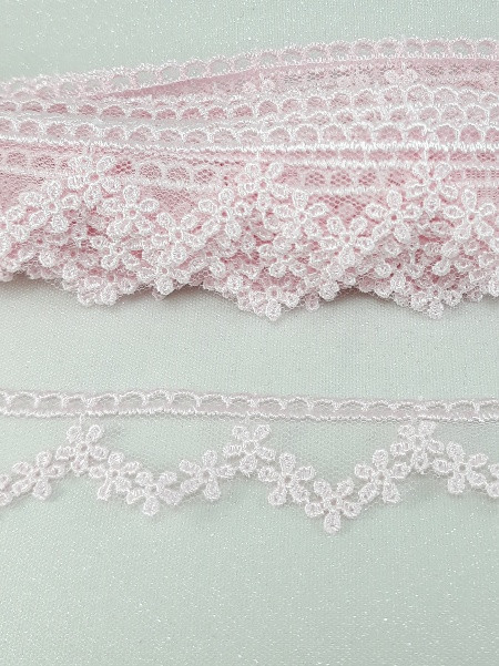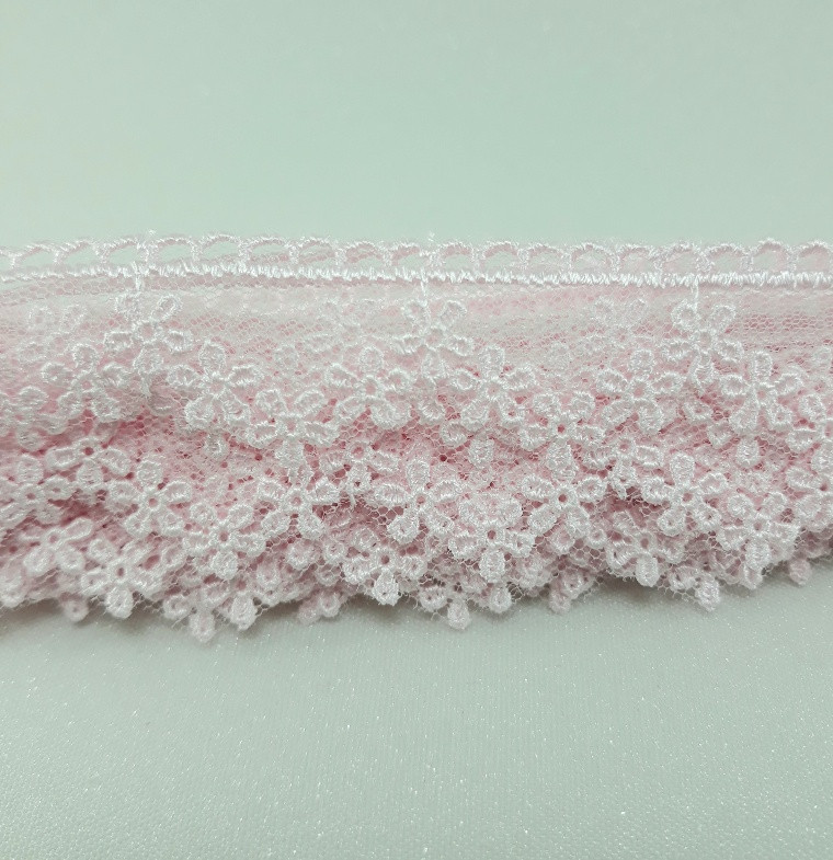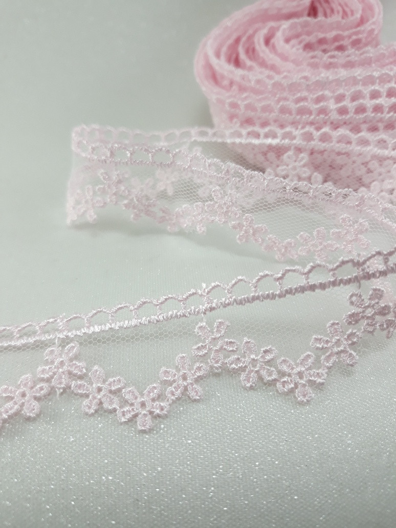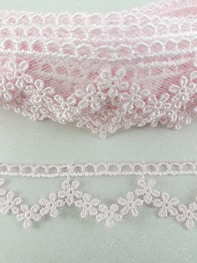 Delikatna koronka na tiulu w kolorze różowym.