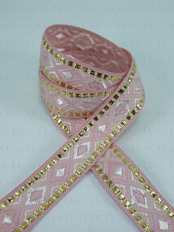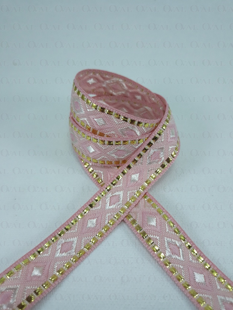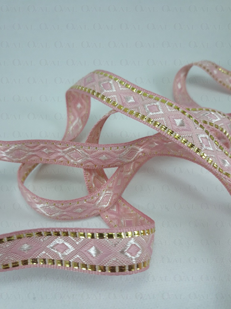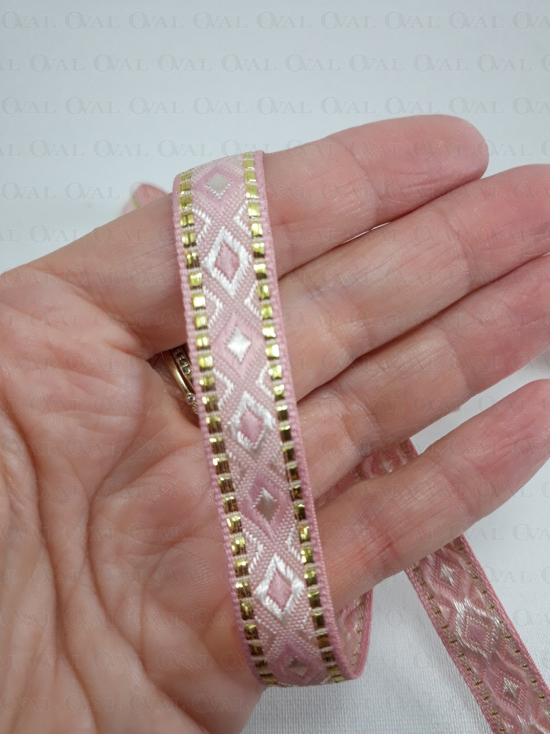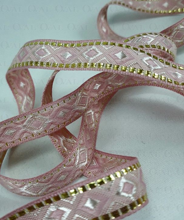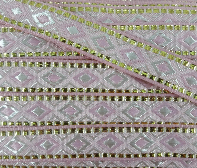 Ozdobna taśma w stylu etno z lekkim połyskiem i złotym akcentem.