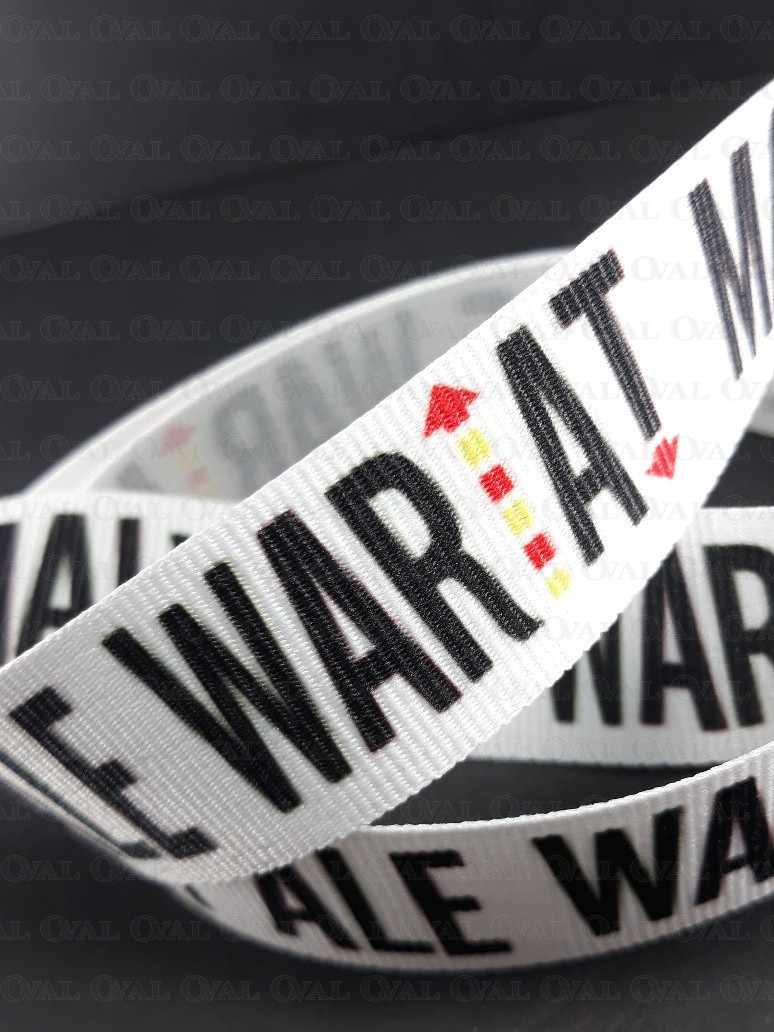 Kolor:biała taśma z czarnym napisem z czerwonymi i żółtymi akcentami