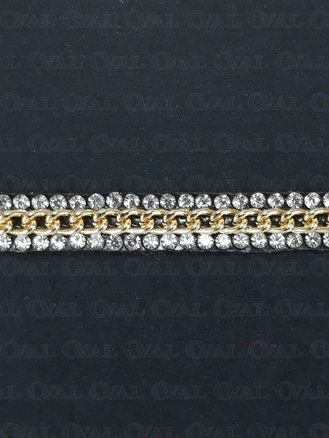 Taśma z kryształkami i łańcuszkiem zatopionymi w sylikonie termoprzylepnym.
