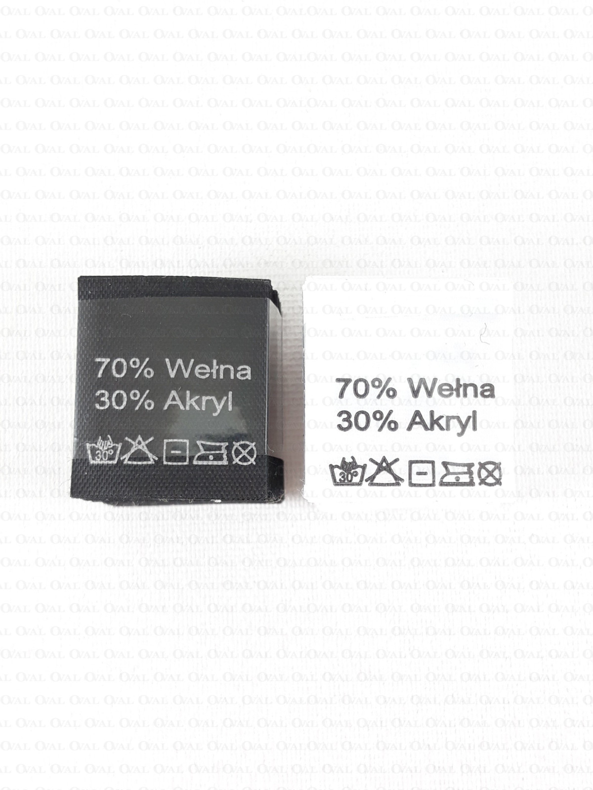 Wszywka odzieżowa zawierająca skład surowcowy oraz przepis prania uszytego produktu.