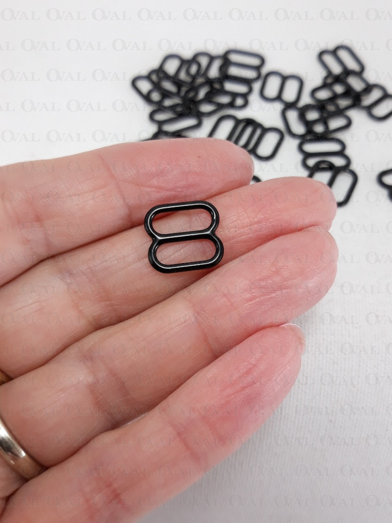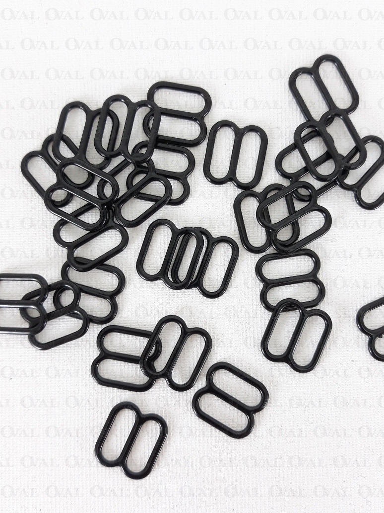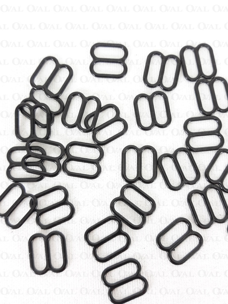 Metalowy regulator do ramiączek w kolorze czarnym.