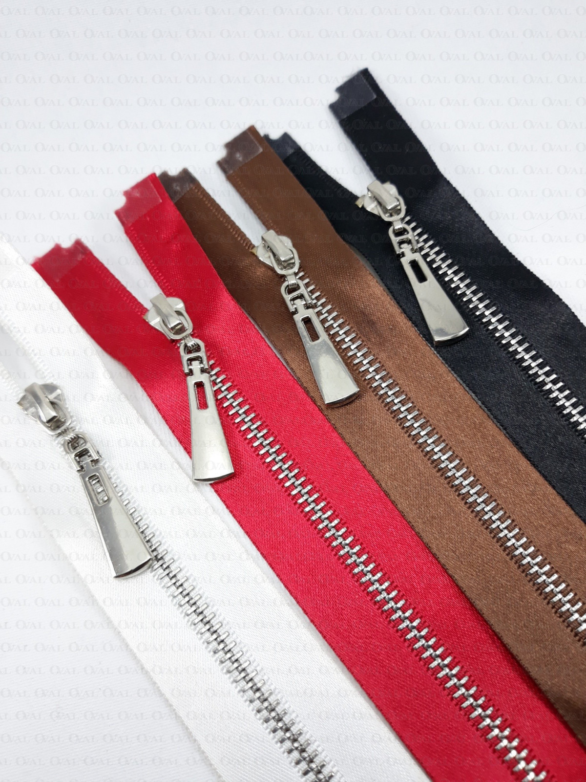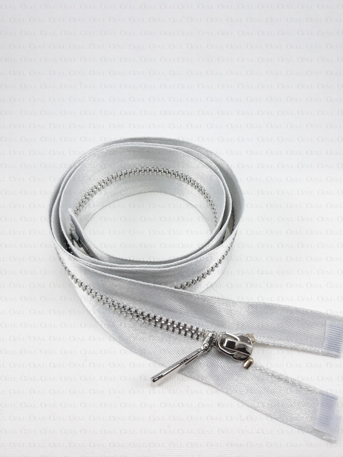 Metalowe zamki rozdzielcze na atłasowej taśmie ze srebrnymi ząbkami