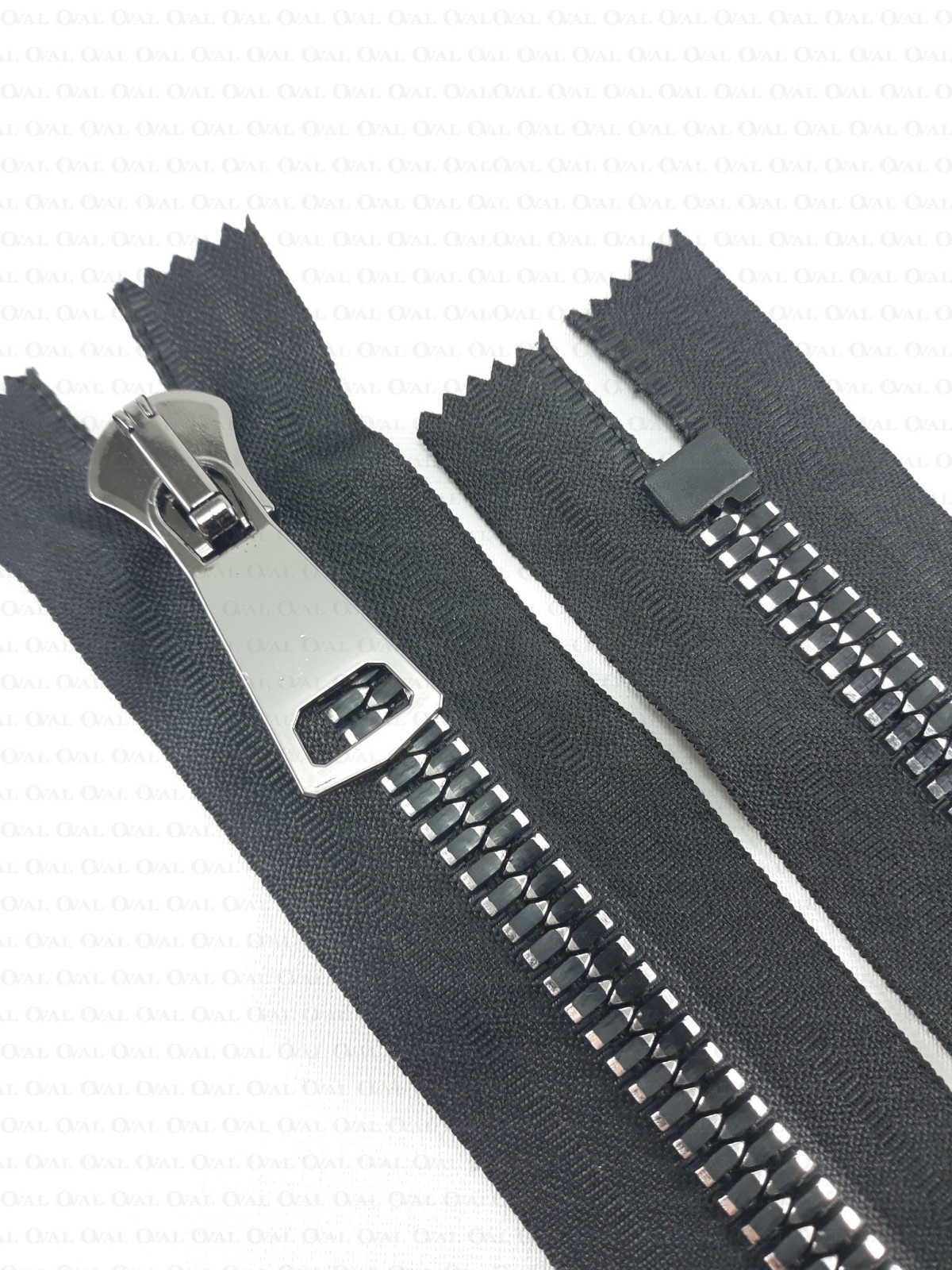 Czarna taśma z czarno -srebrnymi ząbkami i metalową końcówką w ciemnym niklu