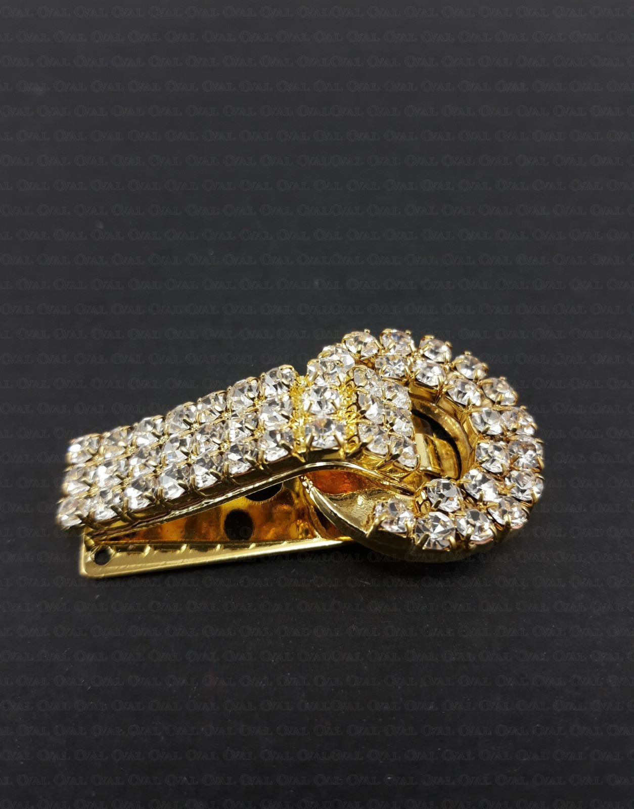 Zapięcie metalowe typu keska z dżetami, w kolorze złotym.